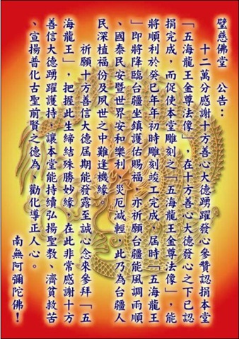1、凡前來本堂參與經典課程及放生聖會者,即可獲贈由「五方龍王」特命本堂堂主佛一禪師協助開光加持「五方龍王吉祥福袋」乙個。(已有領取者,可每半年回娘家過爐乙次。)